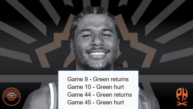 01月24日讯 太阳与老鹰的比赛正在进行,第二节,杰伦·格林突然走回了更衣室。太阳媒体直接绷不住了,晒出统计:赛季第9场复出、第10场受伤;赛季第44场复出、第45场又受伤了……...