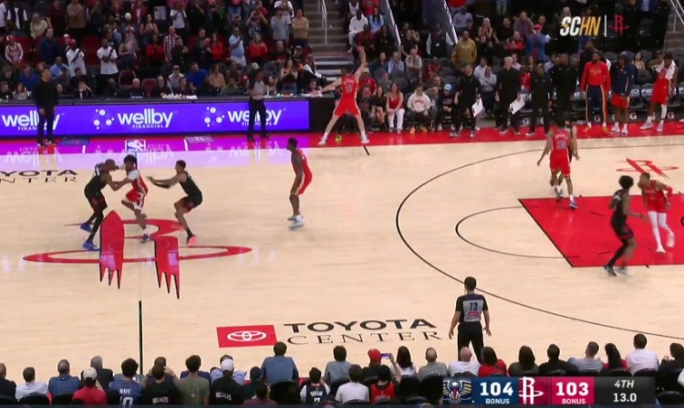 末节最后13秒,芬尼-史密斯开边线球5秒违例,裁判没有吹罚。火箭叫暂停,暂停后再发球,杜兰特完成了致胜跳投。↓